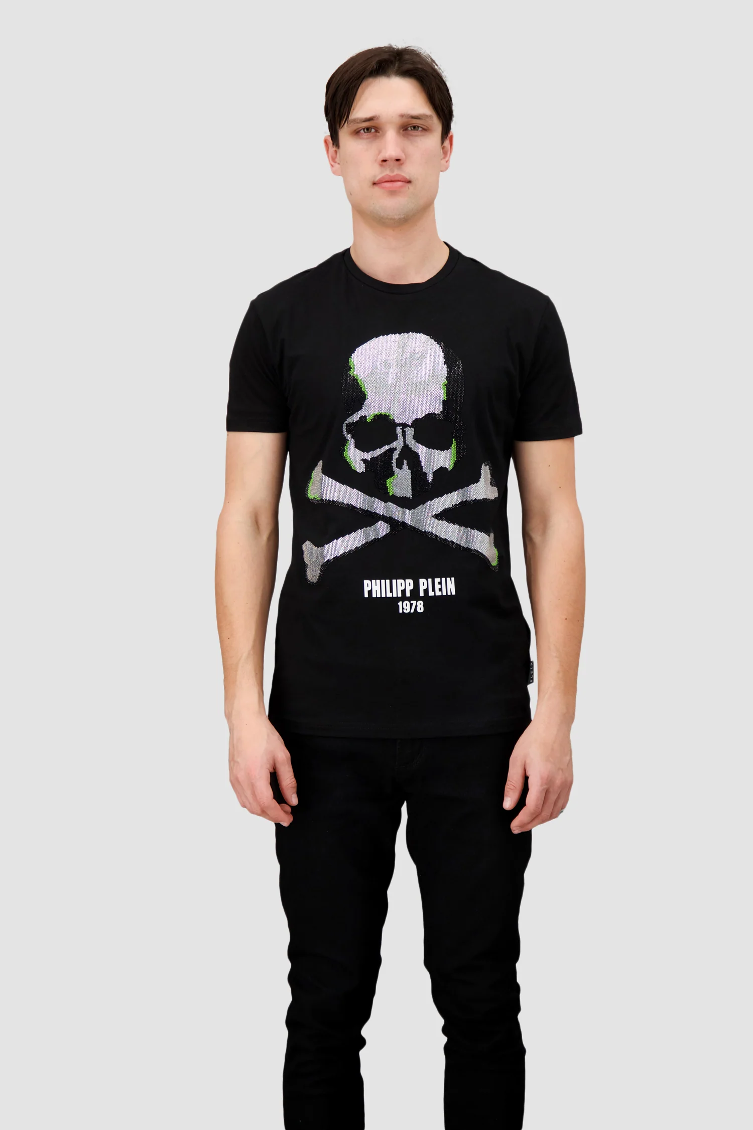 The Philipp Plein Skull Strass t-shirt is an iconic piece boasting the brand's signature skull and lettering, intricately adorned with rhinestones.